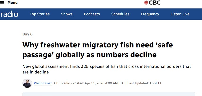 Latest News Dr. Cooke talks to CBC about migratory fishes in Canada (April 2026) Posted 2 hours ago To listen please go to: https://www.cbc.ca/radio/day6/freshwater-migratory-fish-decline-9.7156255